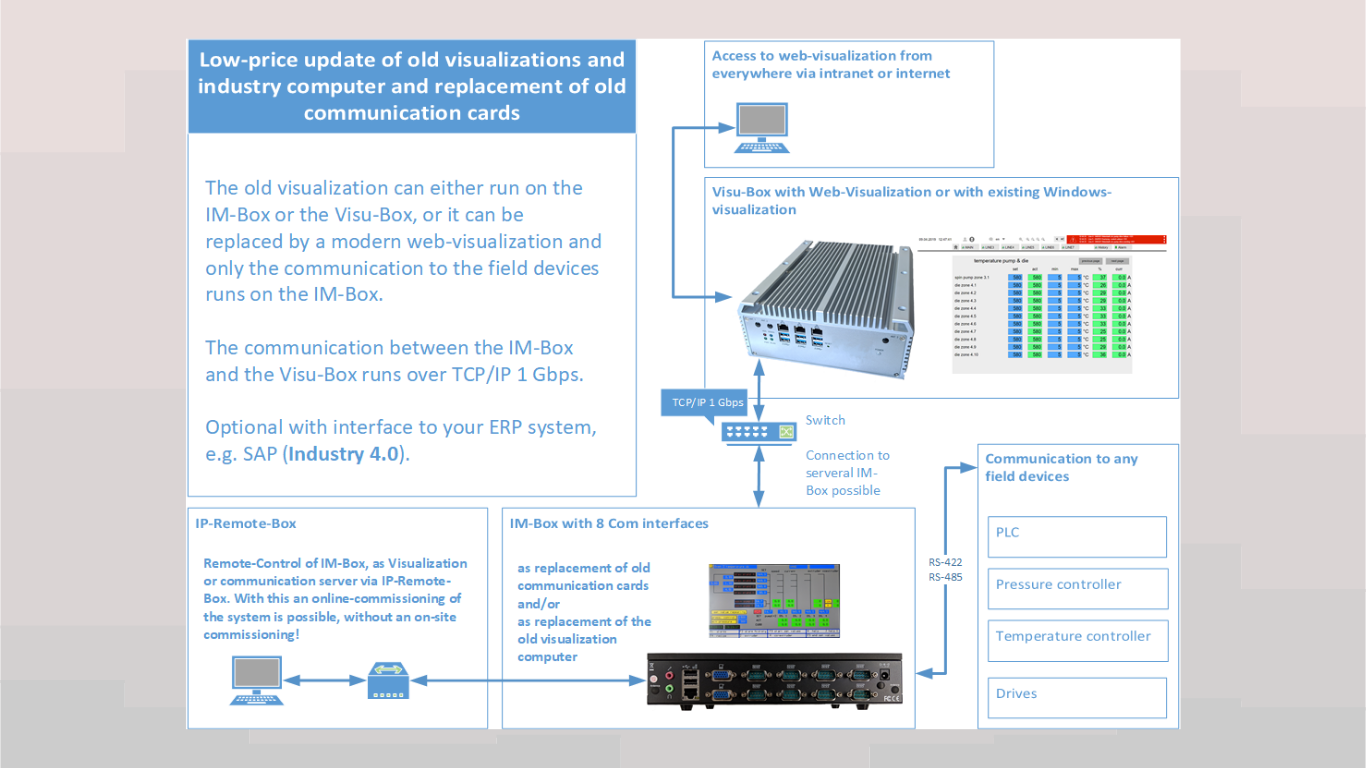 - Communication runs via the IM-Box, connected to the Visu-Box via 1 Gbps TCP/IP.